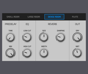 Reverb algorithms: SMALL ROOM - From close ambience up to a small room. LARGE ROOM - General purpose room. DENSE ROOM - Room with a thick decay tail. PLATE - Bright with a long smooth decay tail. |