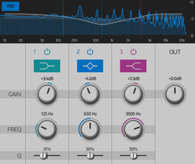 Use the spectrum analyzer to help visualize the frequency content of the signal. The PRE / POST button toggles its view between the EQ's input or output. The OUT control sets the master gain when the effect is enabled. Use this to minimize volume differences when the effect is enabled or disabled. |